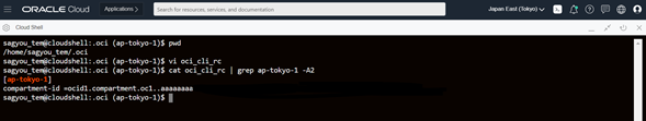 OCI CLI構成ファイルにプロファイル[ ap-tokyo-1 ]のデフォルトコンパートメントを追加する手順です。