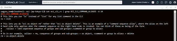 エイリアスは、oci_cli_rcファイルのOCI_CLI_COMMAND_ALIASESで指定されています。oci_cli_rcファイルのOCI_CLI_COMMAND_ALIASESを確認すると、現在「ls」が「list」のエイリアスとして指定され、「rm」が「os.object.delete」のエイリアスであることがわかります。