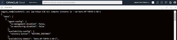 ここでは、コマンド「oci compute instance list --availability-domain <availability-domain>」の代わりに、コマンド「oci compute instance ls --ad <availability-domain>」を実行してみます。これも正常に機能します。
