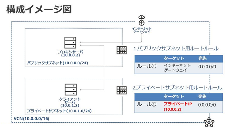 要件はOracle Cloudの基本機能では提供されていない内容であったり、お客様は既にプロキシサーバの運用ノウハウを持っていることもあり、それらを生かすにはOracle Cloudでもプロキシサーバを利用することがベストであると考えました。