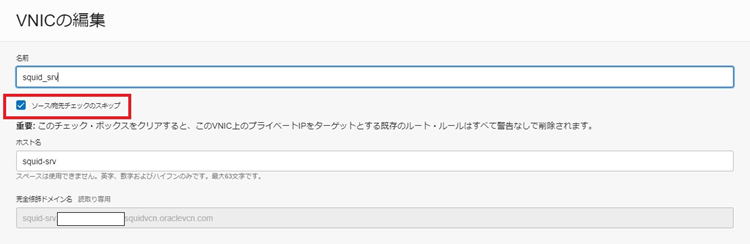 なお、ルーティングルールでプライベートIPをターゲットに設定する場合、該当のIPが割り当てられているVNICで「ソース/宛先チェックのスキップ」を有効とする必要がありますのでご注意ください。