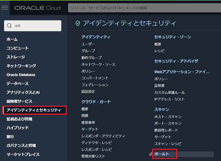 1.OCIコンソールメニューから[アイデンティティとセキュリティ >> ボールト]をクリックします。