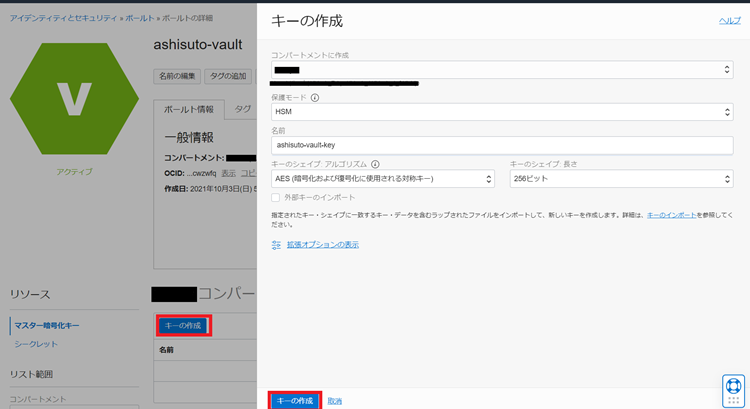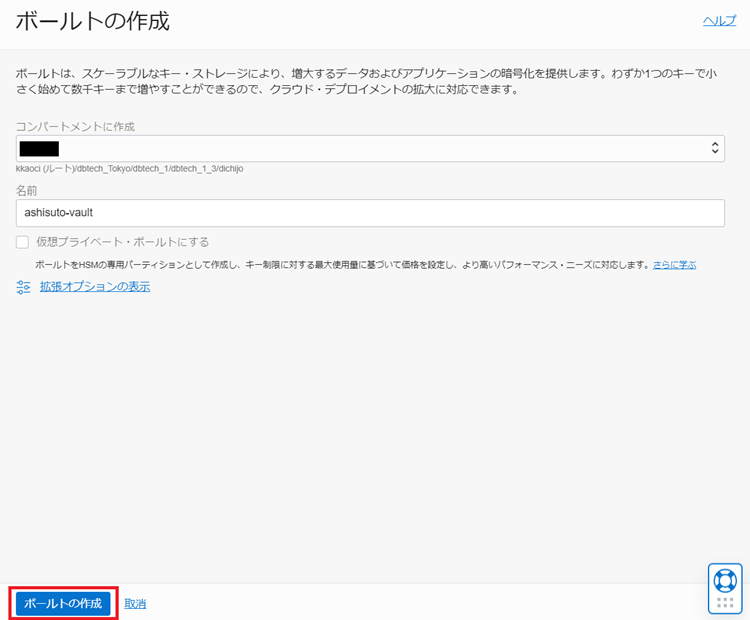 3.作成先のコンパートメントを選択して名前を入力後「ボールトの作成」をクリックします。