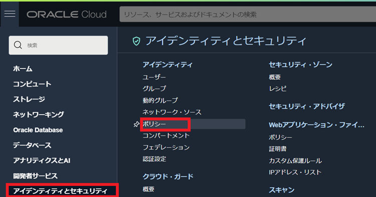 1.OCIコンソールメニューから[アイデンティティとセキュリティ >> ポリシー]をクリックします。