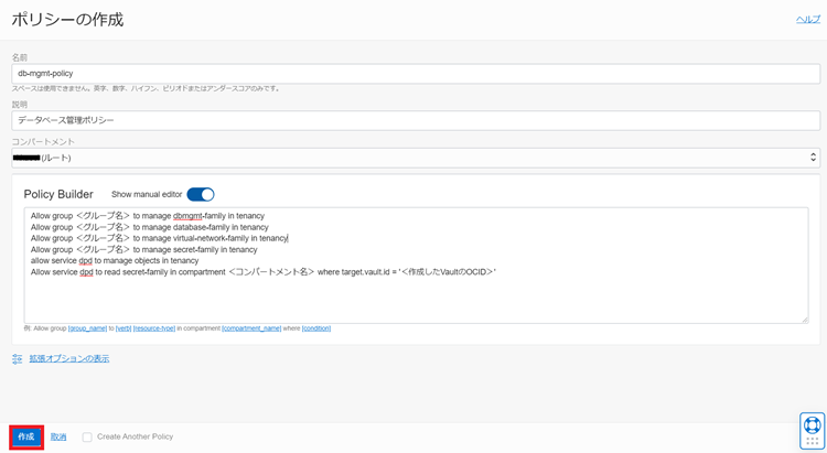 Allow service dpd to read secret-family in compartment <コンパートメント名> where target.vault.id = '<作成したVaultのOCID>'