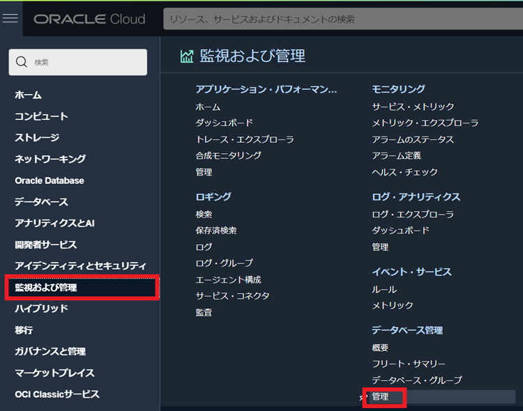 1.OCIコンソールメニューから[監視および管理 >> 管理(データベース管理)]をクリックします。