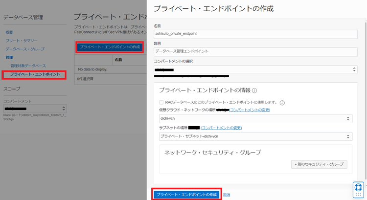 2.データベース管理画面の左側の「プライベート・エンドポイント」をクリックして「プライベート・エンドポイントの作成」をクリックします。その後、設定値を入力し「プライベート・エンドポイントの作成」をクリックしてプライベート・エンドポイントを作成します。