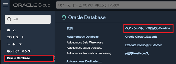 2.OCIコンソールメニューから[Oracle Database >> ベア・メタル、VMおよびExadata]をクリックして管理対象のデータベースの詳細画面を開きます。