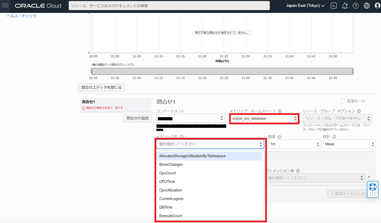 または、OCIコンソールメニューから[Observability & Management >> メトリック・エクスプローラ]をクリックして、問合せの「メトリック・ネームスペース」から”oracle_oci_database”を選択し、「メトリック名」からグラフで確認した項目以外の情報を確認することも可能です。