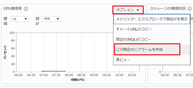 1.アラームを設定したいチャートのオプションから「この問合せにアラームを作成」をクリックします。今回はCPU使用率を選択します。
