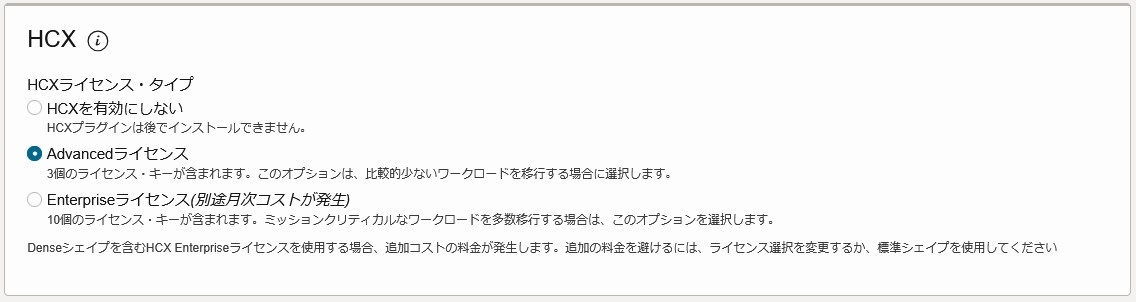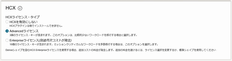 HCXの検証時には、Replication Assisted vMotion Migration(RAV)やMONなどのEnterpriseライセンスが必要な機能を利用するかを検討した上で、ライセンスやシェイプを選択してください。