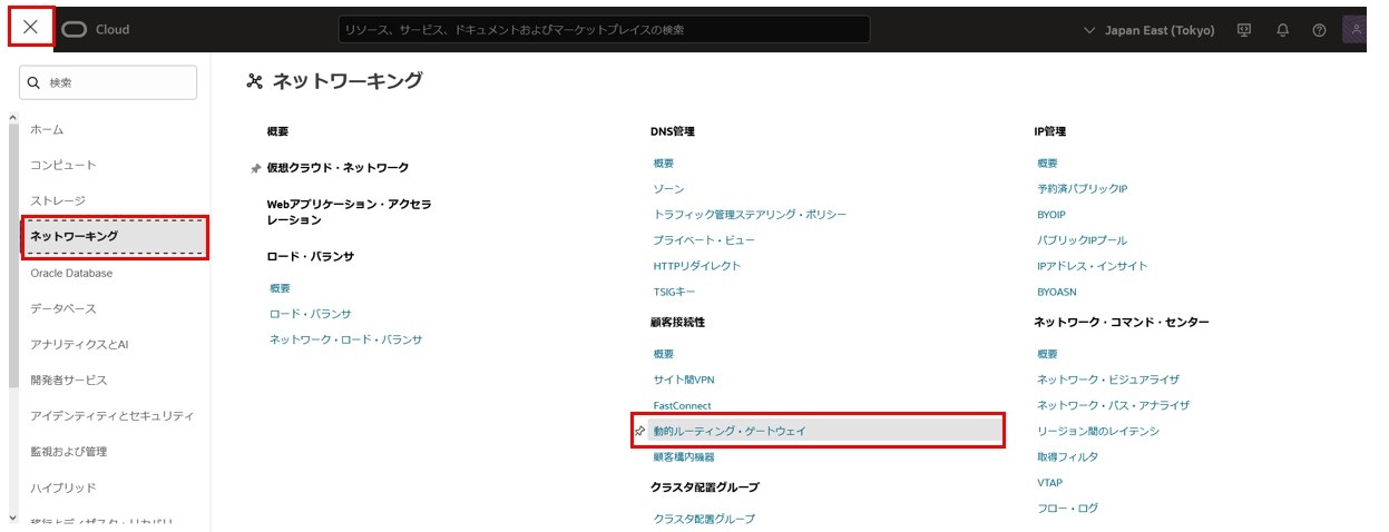 2-3-1-1. OCI Webコンソールから、左上のメニュー > ネットワーキング > 動的ルーティング・ゲートウェイ へ進みます。