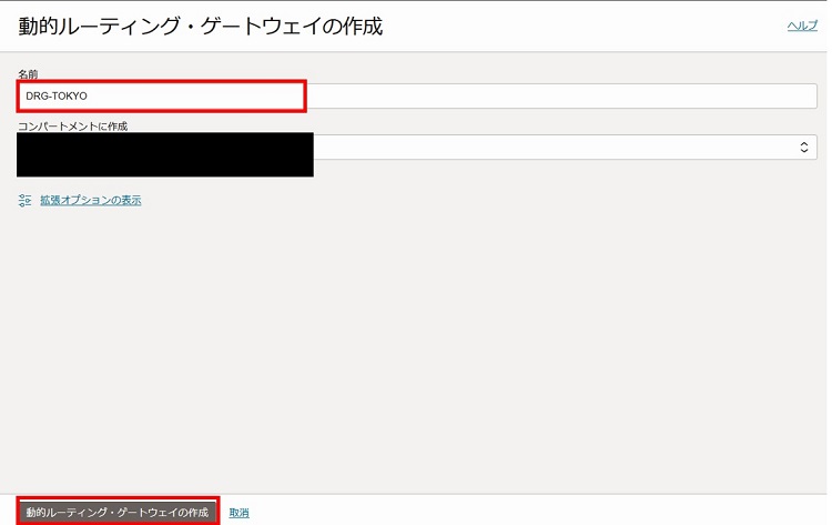 2-3-1-3. DRG名を入力し、「動的ルーティング・ゲートウェイの作成」を選択します。