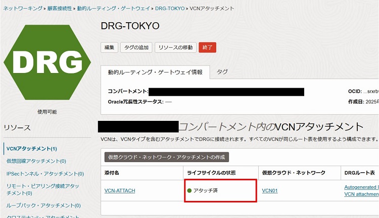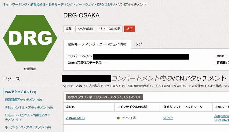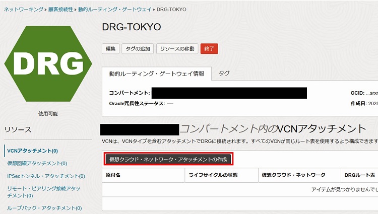 2-3-1-4. DRGの作成後、詳細画面のVCNアタッチメントリソースから「仮想クラウド・ネットワーク・アタッチメントの作成」を選択します。