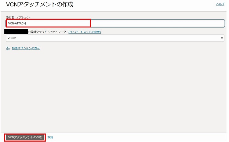 2-3-1-5. アタッチメント名を入力し、DRGと紐づけるVCNを選択後、「VCNアタッチメントの作成」を選択します。
