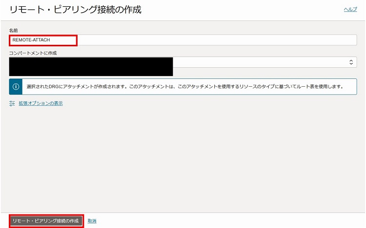 2-3-1-8. リモートピアリング接続用アタッチメント名を入力し、「リモート・ピアリング接続の作成」を選択します。