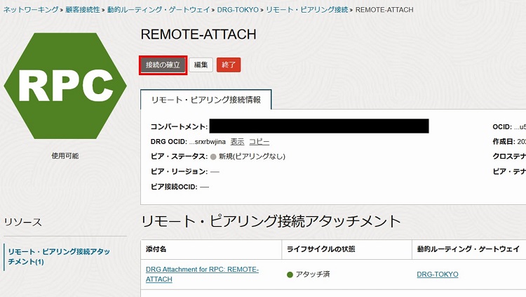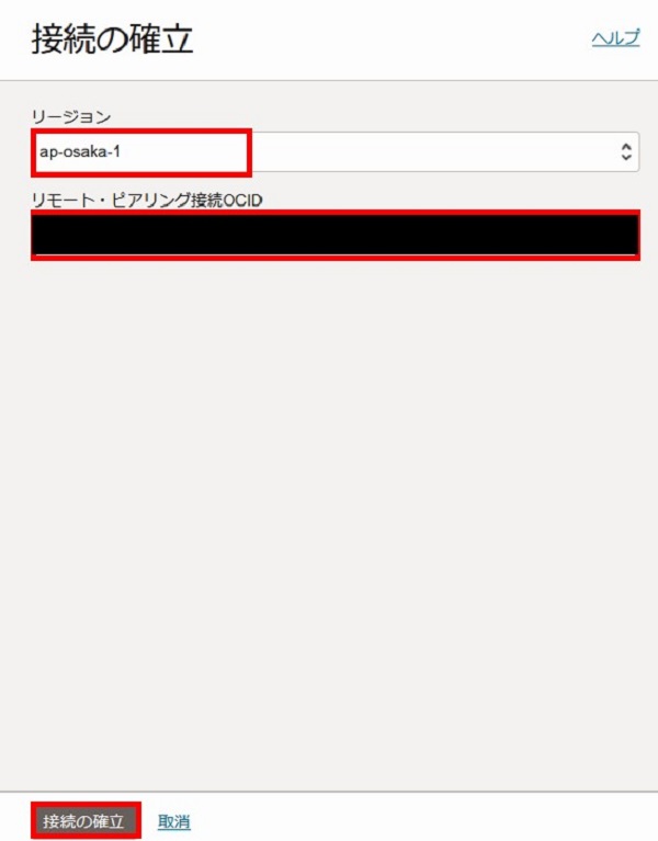 2-3-1-13. ピアリング接続先のリージョンとリモート・ピアリング接続のOCIDを入力し、「接続の確立」を選択します。