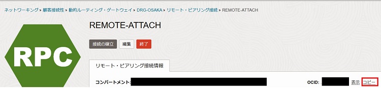 ※リモート・ピアリング接続のOCIDは、リモート・ピアリング接続の詳細画面のOCIDの箇所からコピー可能です。