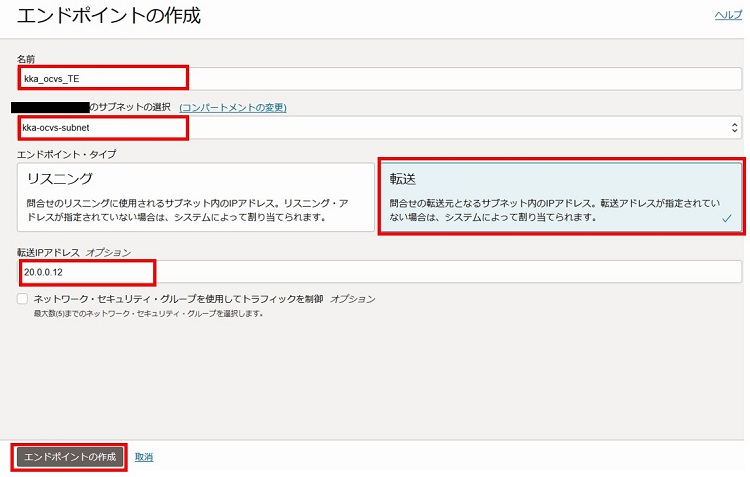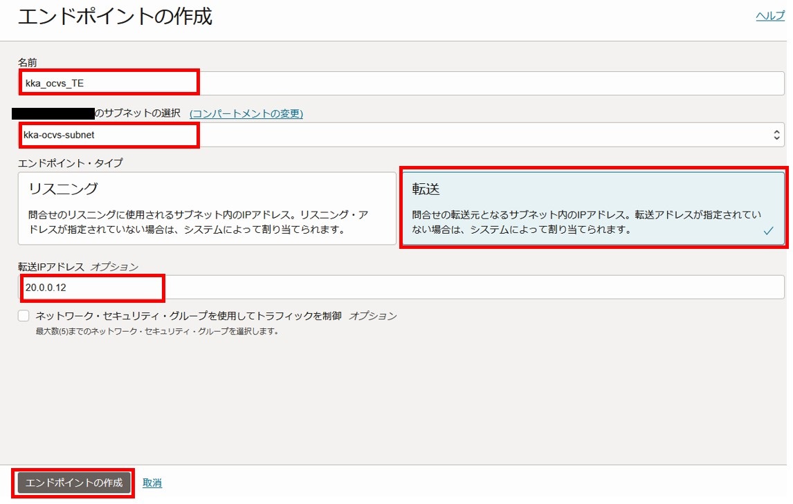 2-3-2-3. 名前、サブネット、タイプ、IPアドレスを入力し「エンドポイントの作成」を選択します。