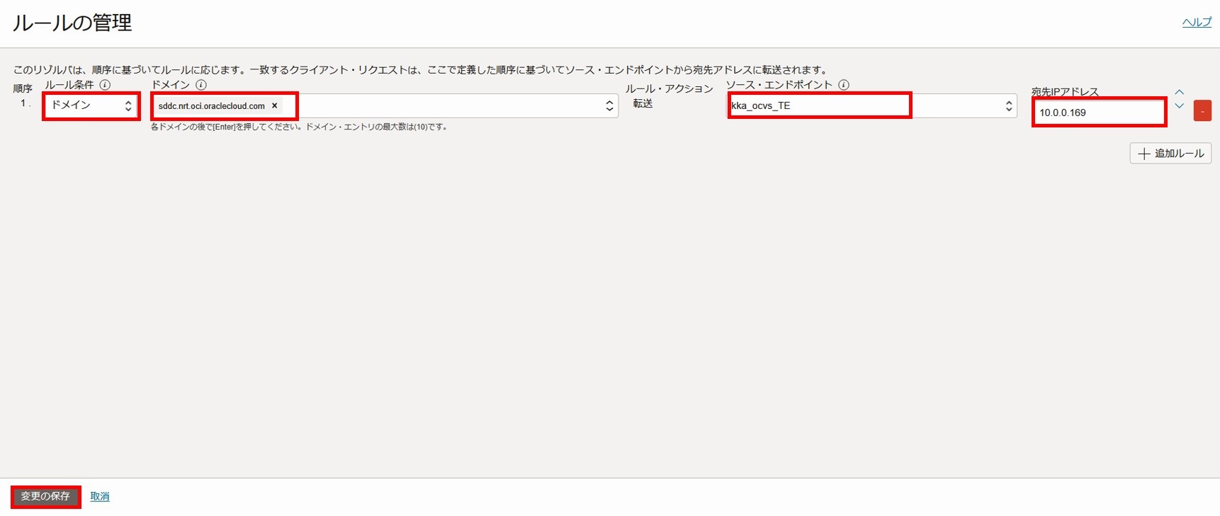 ルール条件に「ドメイン」、ドメインに「sddc.nrt.oci.oraclecloud.com」、ソースエンドポイントに大阪リージョンの転送エンドポイント、宛先IPアドレスに東京リージョンのリスニングエンドポイントのIPアドレスを指定し、「変更の保存」を選択します。