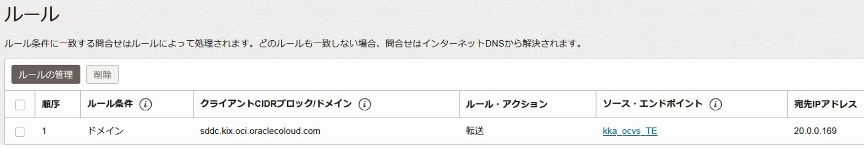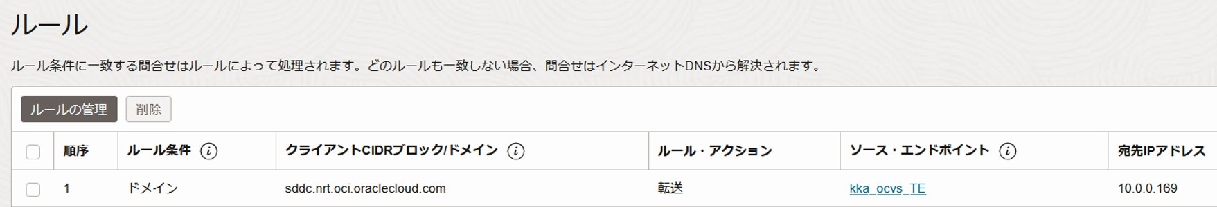 ※OCVS環境のドメインは、デフォルトで「sddc.<リージョン・キー>.oci.oraclecloud.com」が設定されます。大阪リージョンでは、東京リージョン宛ての通信を転送したいため、東京リージョンのドメイン「sddc.nrt.oci.oraclecloud.com」を指定します。