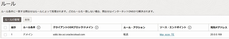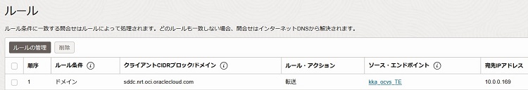 ※東京リージョンでは、大阪リージョン宛ての通信を転送したいため、大阪リージョンのドメイン「sddc.kix.oci.oraclecloud.com」を指定します。