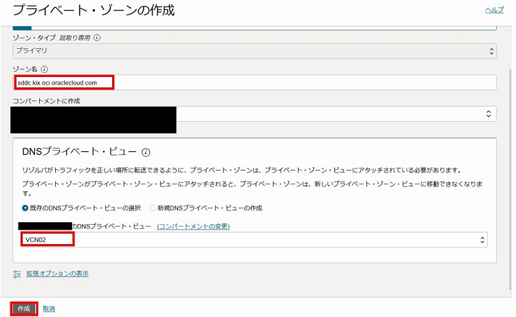 2-3-2-12. ゾーン名に転送ルールに指定したドメイン名、プライベート・ビューは既存のVCNに紐づいているビュー(デフォルトでVCNと同じ名前)を選択し、「作成」を選択します。