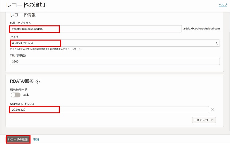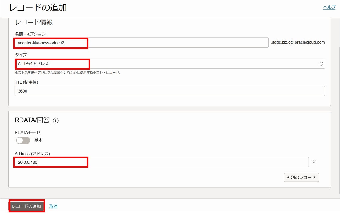 2-3-2-15. 名前、レコードタイプ、IPアドレスを入力し、「レコードの追加」を選択します。