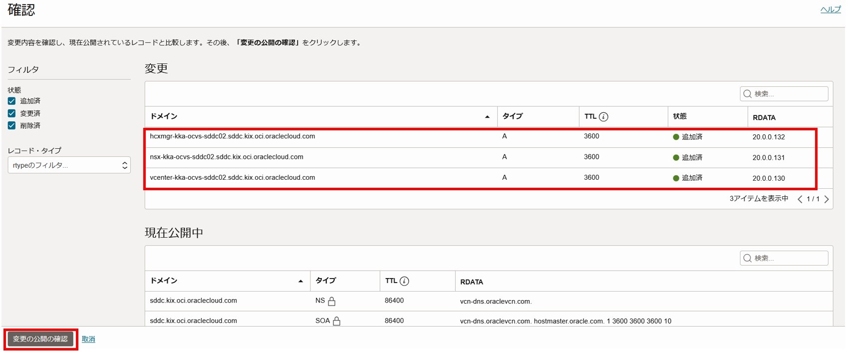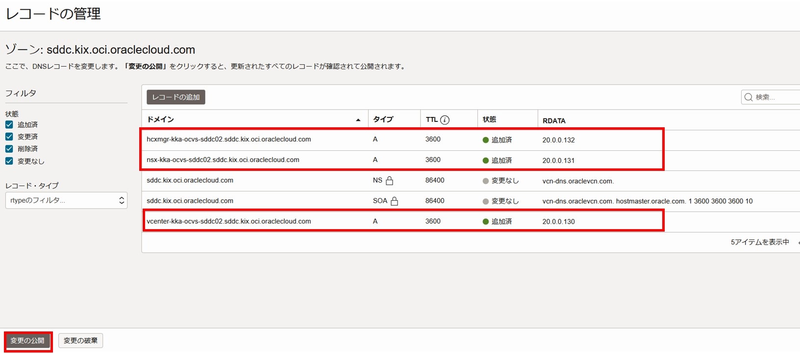 2-3-2-16. vCenter、NSX Manager、HCX Managerのレコードを追加し、「変更の公開」を選択します。