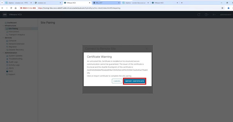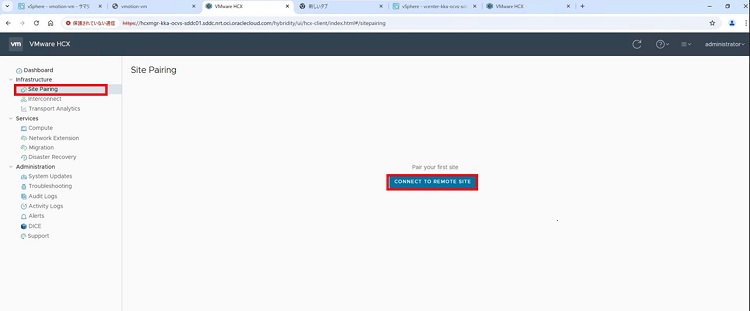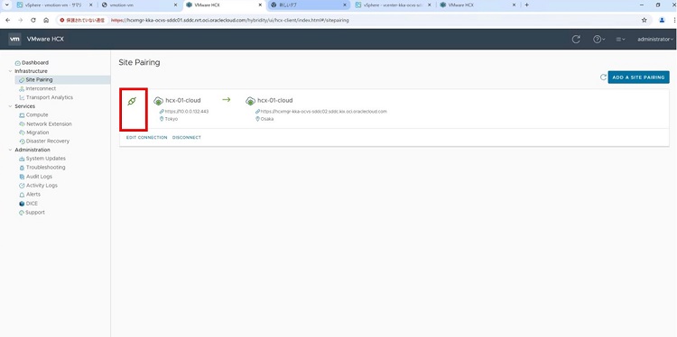 これから東京リージョンと大阪リージョンのそれぞれのHCX Managerの接続を確立します。