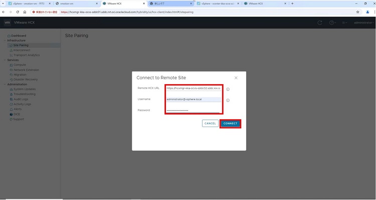 2-4-3. ペアリング先のHCX Managerの情報を入力し、「CONNECT」を選択します。