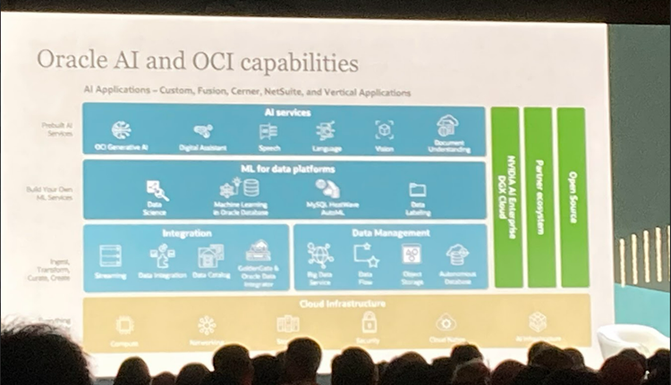 「AIがデータにアクセスするようになったら、どのようにしてテクノロジーを制御するのか?データの行き先と使用方法をどのように確認するのか?この問題を解決するためにCohere社と提携し、生成AIサービス『OCI Generative AI』を提供する(間もなくリリース予定)。分散クラウドモデルはどこでも利用でき、なおかつ顧客が自社データをどこに置くか、どの地域内で利用可能かを完全に管理することができる。つまりデータがどこでどのように使用されているかを正確に管理・把握できる。」