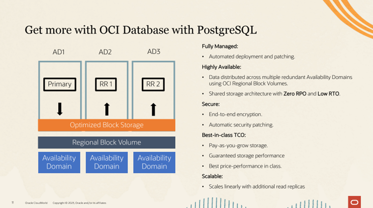 「オラクルはパッチ適用、重要な修正、セキュリティ修正などのソフトウェアの自動化されたライフサイクル管理を担当する。しかし、重要なポイントは、データベースに最適化されたストレージを使用する共有ストレージ アーキテクチャだ。これにより、新しいブロックを使用してデータベースを複数の可用性ドメイン間で複製できるようになる。コストを削減しながら、実際に使用したストレージ分だけ支払えばよい。ミッションクリティカルなアプリケーションに必要な可用性と耐久性のレベルでサービスを提供するためにデータベースの実行に重点を置いている。現在ベータ版であり、初期テストの結果、Postgres SQLコミュニティバージョンのDatabaseよりも高いパフォーマンスが得られている。」