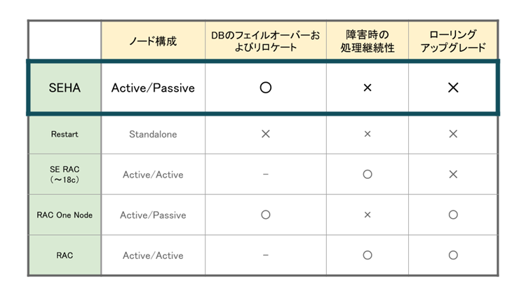 次に、オラクル社純正の他の高可用性構成とSEHAを比較してみましょう。