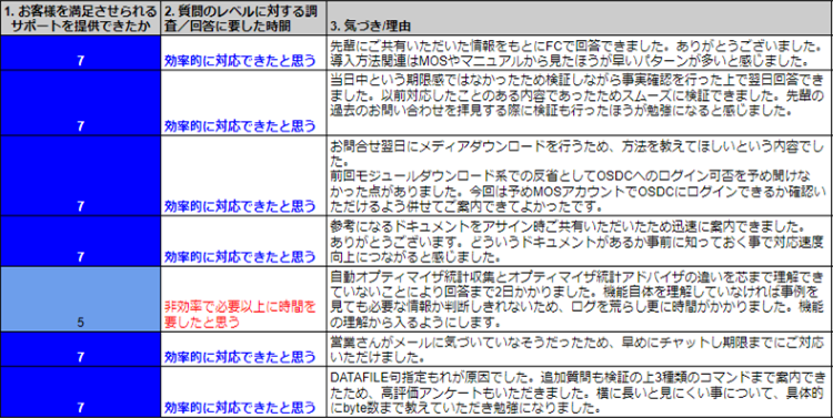 これは、たとえお客様からのアンケート評価が「非常に満足」だったとしても、自分自身が「お客様を満足させることができた」と感じるサポートサービスを提供している意識がなければ、サービスの品質を一貫して保つことはできない、という考えから始めたそうです。