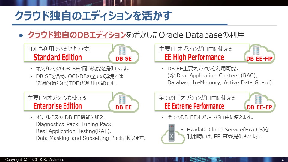 Oracle CloudではOracle Databaseにおけるクラウド独自のエディションが用意されています。