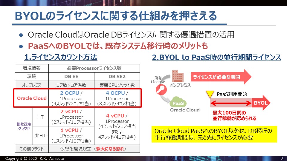 Oracle DatabaseをBYOLで利用する際、ライセンスの優遇措置の仕組みを活かすという点もポイントの1つです。