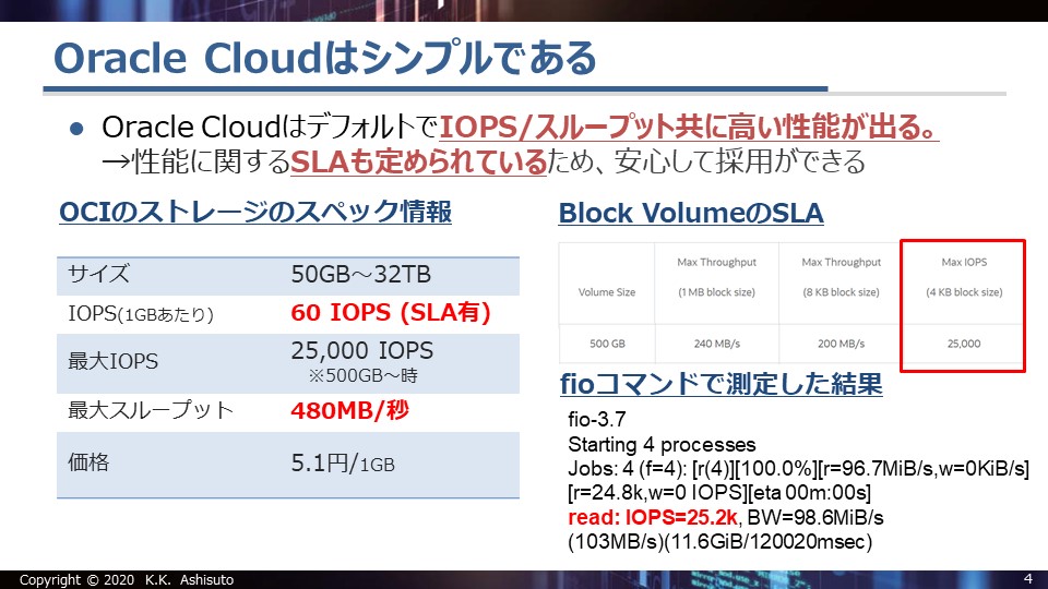 まずは、ストレージ。Oracle Cloudのストレージ(Block Storage)はデフォルトでIOPS/スループット共に高い性能が出るという特徴があります。
