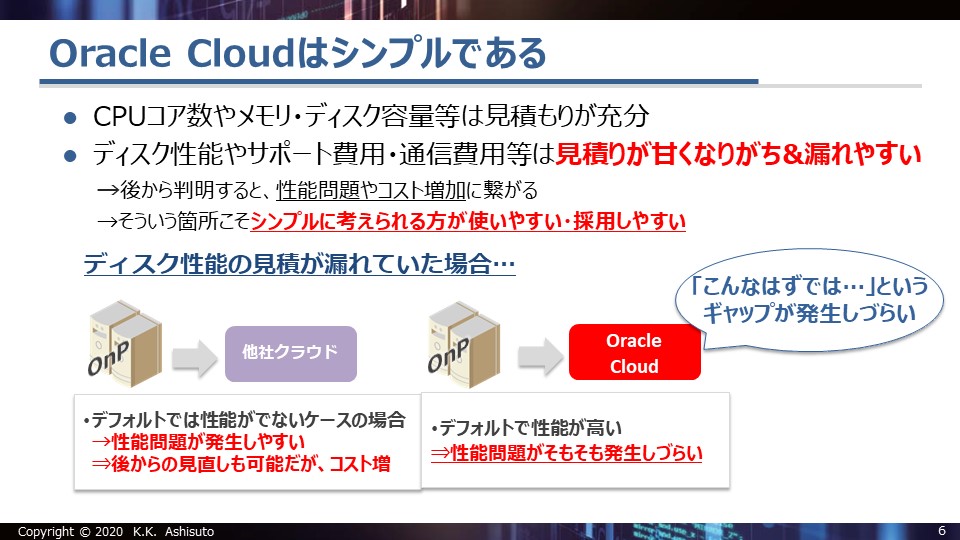 一方、Oracle Cloudはディスク性能がデフォルトで高いという特徴がありますので、ディスク性能の見積もりが漏れてしまっていても、性能問題に発展するケースが少ないという良さがあります。