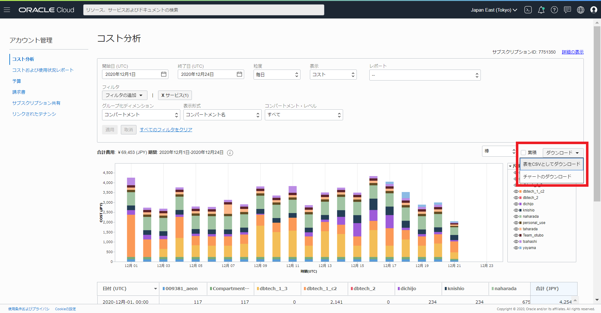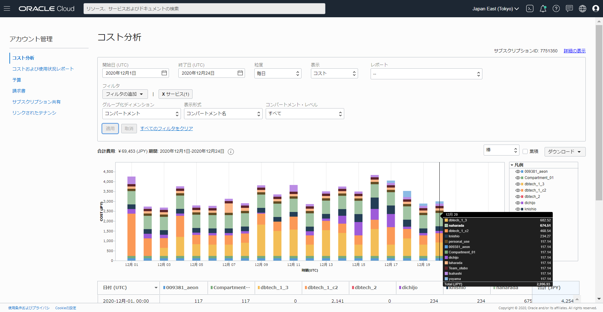 こちらの機能は、コンパートメントごとに課金額を確認することが可能です。