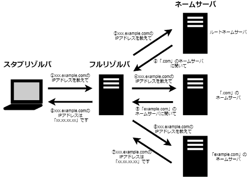 ・フルリゾルバ・・・スタブリゾルバからの要求を受け取り、ネームサーバに問い合わせて名前解決を行う。