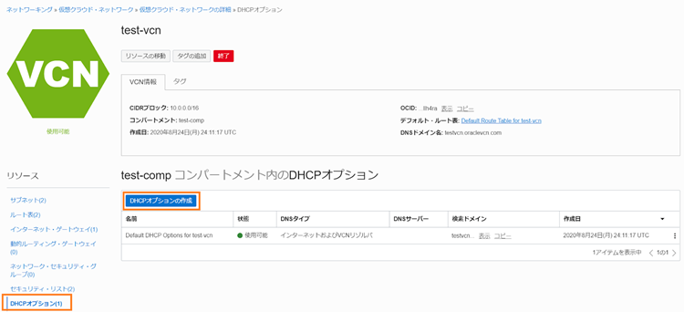 「リソース」-「DHCP」-「DHCPオプションの作成」の順に選択します。