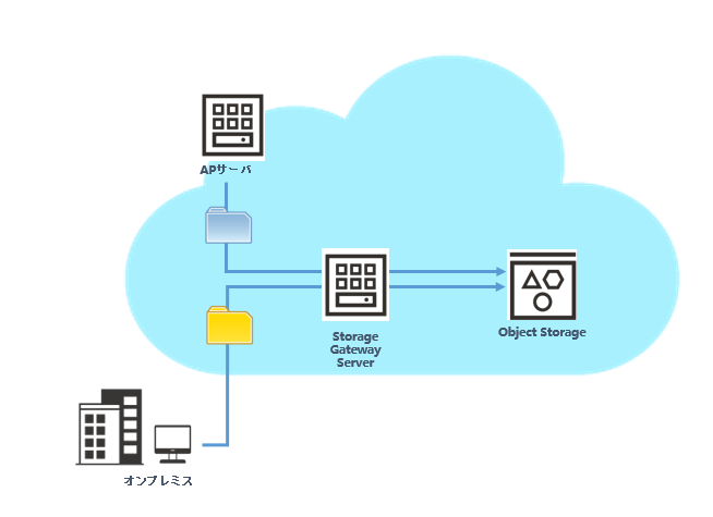 オンプレミスのサーバやOCI上のサービス・インスタンスからStorage Gatewayを経由してObject Storageへ接続し、ファイルの保存などを行います。
