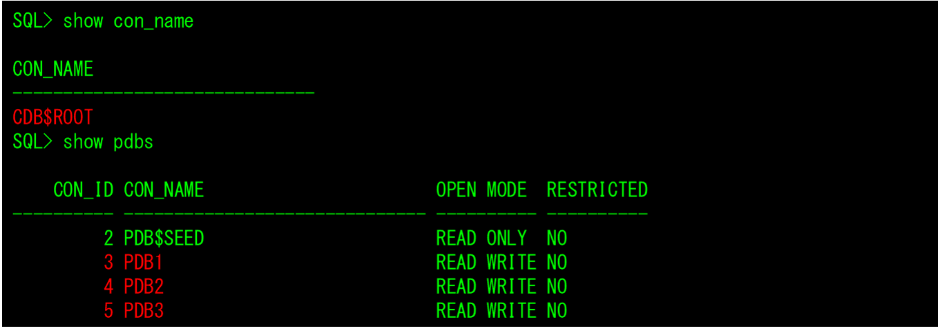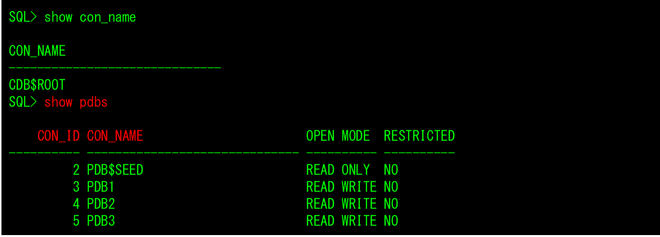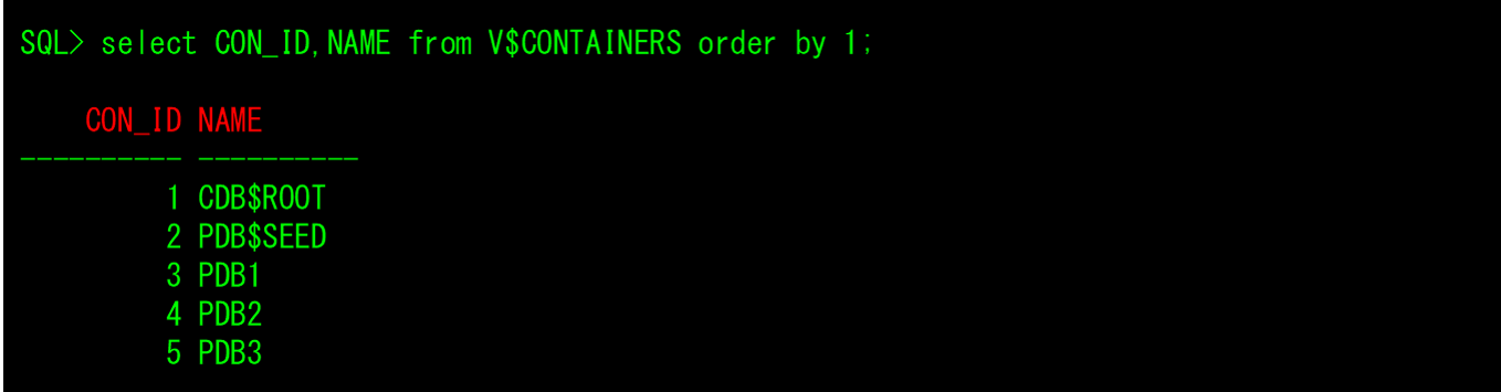 show pdbsコマンドではコンテナID=1は表示されませんでしたが、V$CONTAINERSビューでは1がCDB$ROOTと表示されます。コンテナIDを確認したいだけならshow pdbsで十分です。このほかに、V$PDBS、CDB_PDBSビューなどを利用して一覧を確認できます。