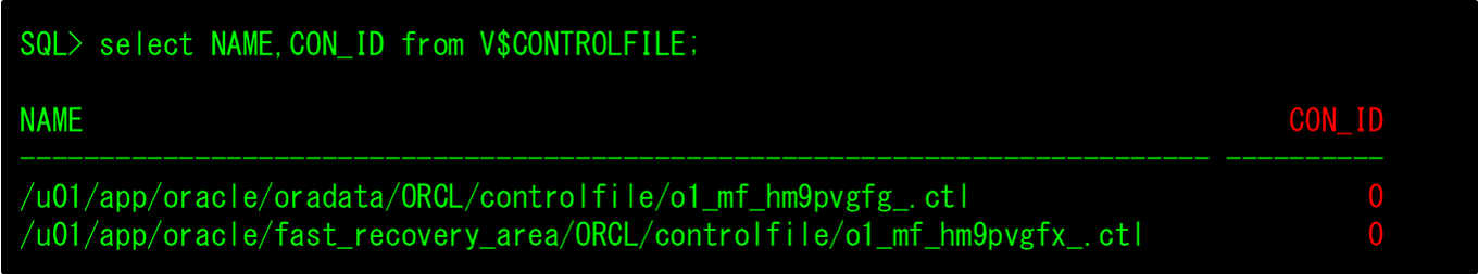 「PDBに接続」している場合でも、例外的に、CDB全体に関する情報(DB全体で共有される制御ファイルやオンラインREDOログファイルの情報など)を参照することができます。これらの情報はCON_ID列で識別できます。下の例では赤字のCON_IDが0になっている部分が該当箇所です。