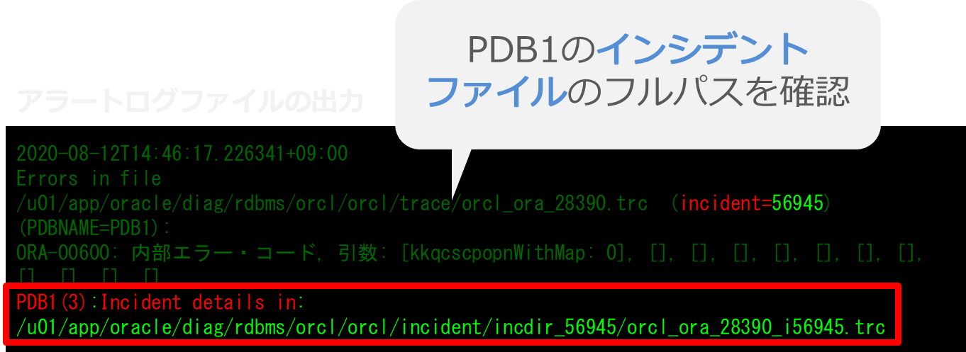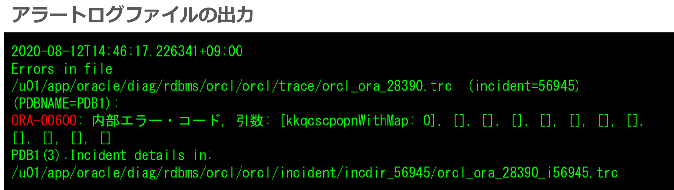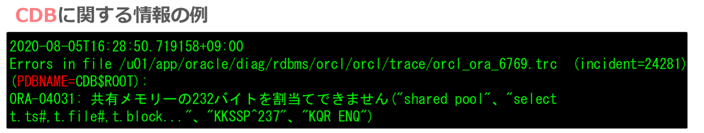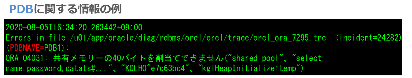 マルチテナントの場合のアラートログファイルの出力例を見てみましょう。マルチテナントでは、CDBと複数のPDBで1つのアラートログファイルに出力されるため、エラーの発生したコンテナの特定には「PDBNAME=」部分を確認します。