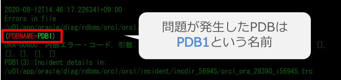 下の例にある「PDBNAME=PDB1」はPDB1という名前のPDBでエラーが発生していることを示しています。