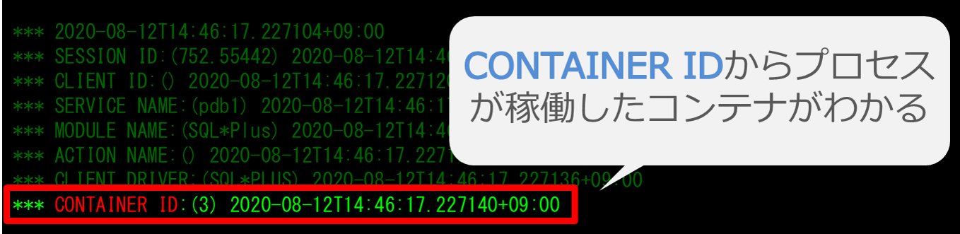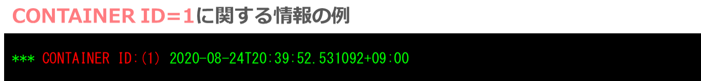 プロセスが稼働していたコンテナの情報は、次のように、ファイルのヘッダー部の「CONTAINER ID」に表示されます。この例では「CONTAINER ID=1」に関する情報を表しています。