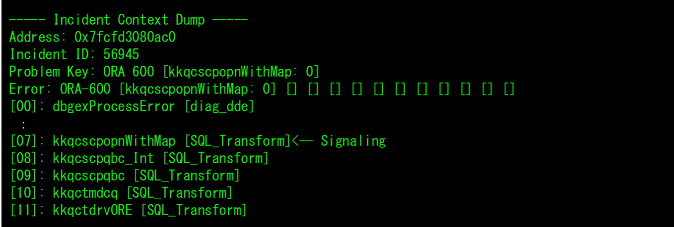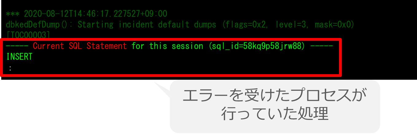 具体的にどんなSQLの実行時にエラーが発生したのかを「Current SQL Statement」から確認します。この例ではINSERT処理でORA600が発生していることがわかります。