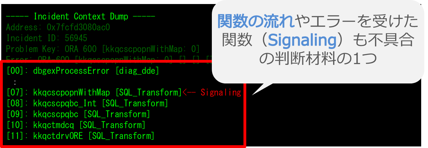 また、お客様が直接解析することは少ないかと思いますが、エラー発生時にプロセスがコールしていた関数は以下の例にある「Incidenet Context Dump」や「Call Stack Trace」から確認できます。